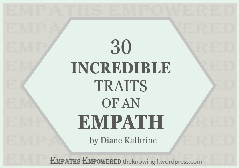 By Diane Kathrine 1. Knowing: Empaths just know stuff, without being told. It’s a knowing that goes way beyond intuition or gut feelings, even though that is how many would describe the knowing. The more attuned they are the stronger this gift becomes. 2. Being in public places can be overwhelming: Places like shopping malls, supermarkets or stadiums, where there are lots … Continue reading 30 Traits of an Empath